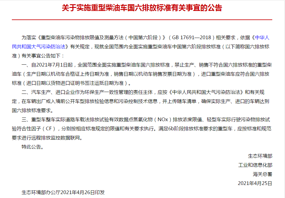 2021年4月26日,**生態(tài)環(huán)境部、工業(yè)和信息化部、海關(guān)總署印發(fā)《關(guān)于實(shí)施重型柴油車國六排放標(biāo)準(zhǔn)有關(guān)事宜的公告》(公告 2021年 第14號(hào))。
